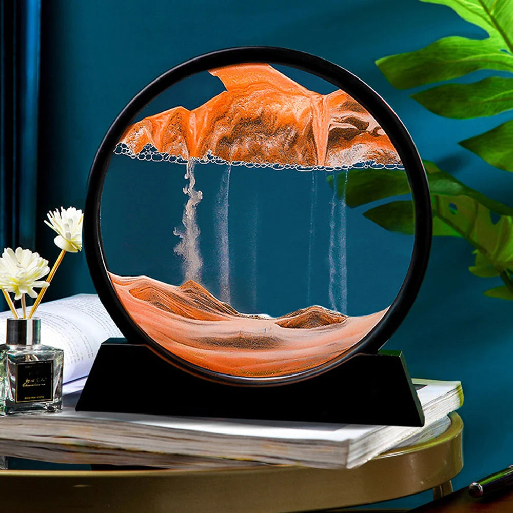 Filled with water and coloured sand, flip the glass disc to see the coloured sand slowly trickle down in a soothing display with LED lights at the base.